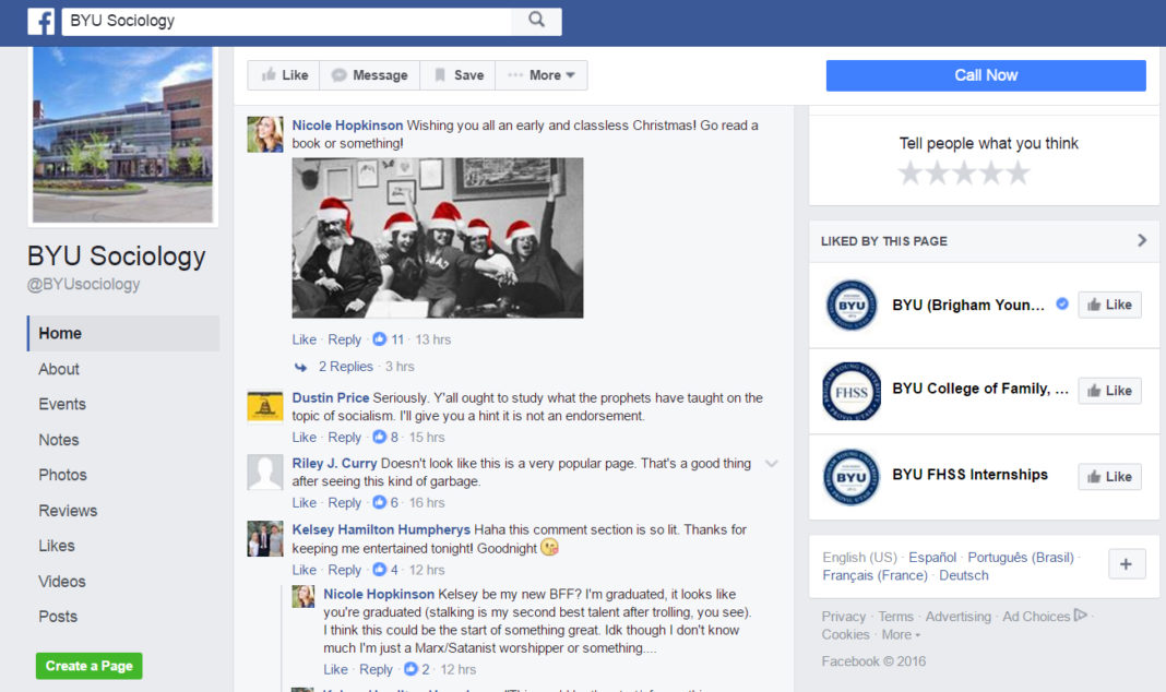 UPDATE 6:15am (9/29/2016): If you are interested in viewing the comments made before the BYU Sociology Facebook page suppressed opposing viewpoints, please see these screenshots saved by a participant.